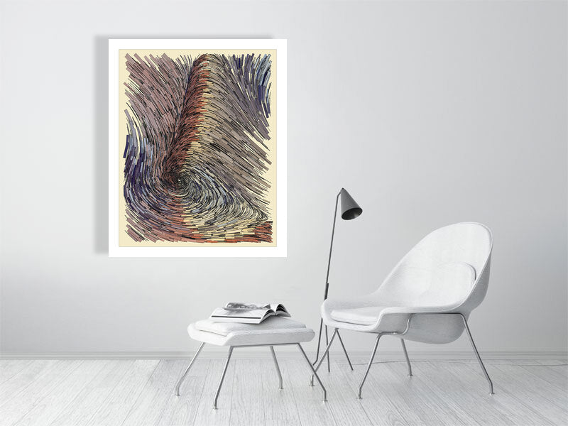 Description: Flow States 2 was generated using a novel algorithm that controlled horizontal and vertical path motion based on independent smoothed fields, which produces more swirling and spiraling flows compared to a more typical single-field approach. The color palette was based on samples from Werner's Nomenclature of Colors (1821). Each flow line was drawn, then layered beneath flowing tiles along its path. This is a three-part limited edition series, with five prints of each that are produced on-demand. No other images from this code and no additional copies will be sold after those.
