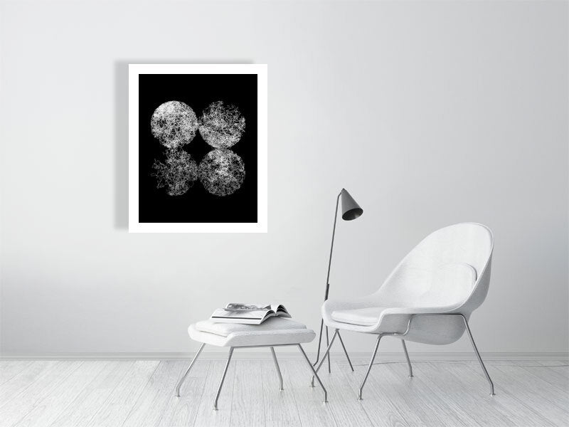 Description: Incompleteness - 1 shows a series of random walk lines that moved among four circular target regions, which look similar to shells on the beach that were eroded by biological and geological forces. Broader structures are preserved but fine details are erased forever into the sea. This single edition art print is the first of a three-part iteration series, where the same algorithm was used to produce three different versions of the artwork.